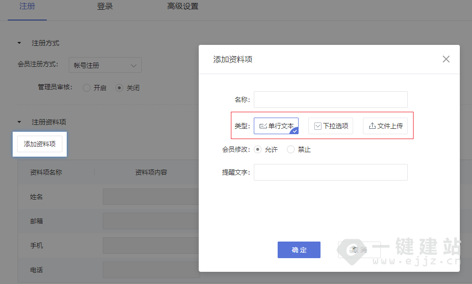 自定义资料项类型支持“单行文本”“下拉选项”“文件上传”。