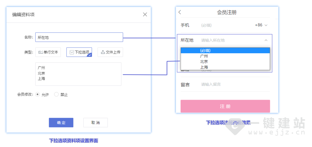 会员修改:允许时,会员提交资料后可以修改已提交信息;禁止后,会员一旦提交资料就不能再修改。