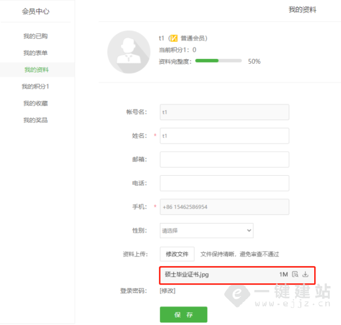 作用一:会员中心的个人资料支持附件(图片)上传,用户注册会员时可上传身份证、学历证明、能力资格证等文件。方便管理员进行审核和验证会员身份。