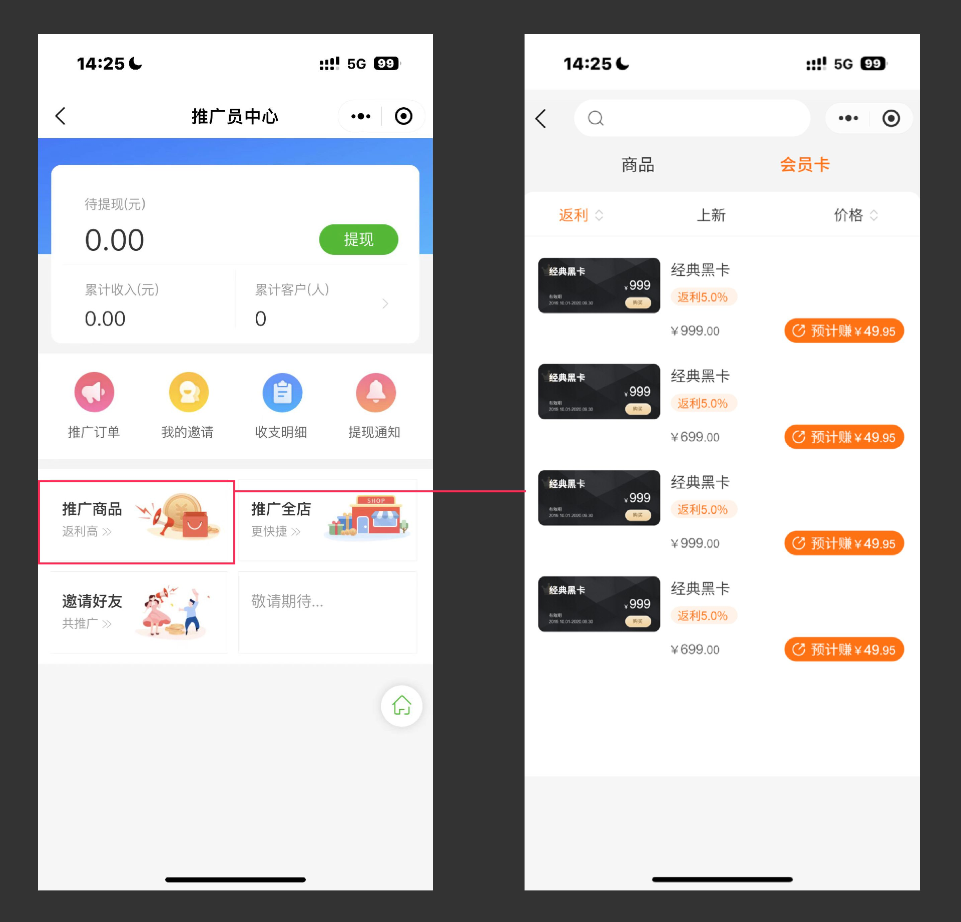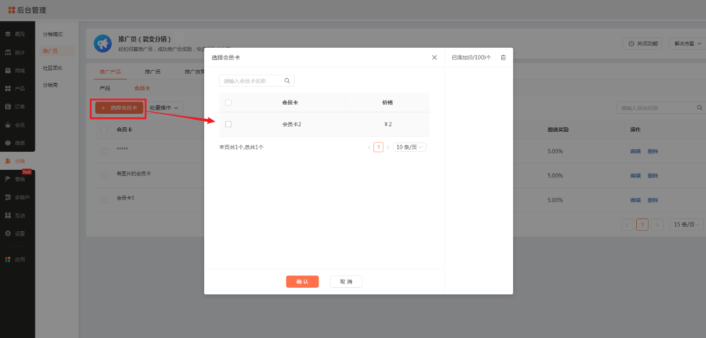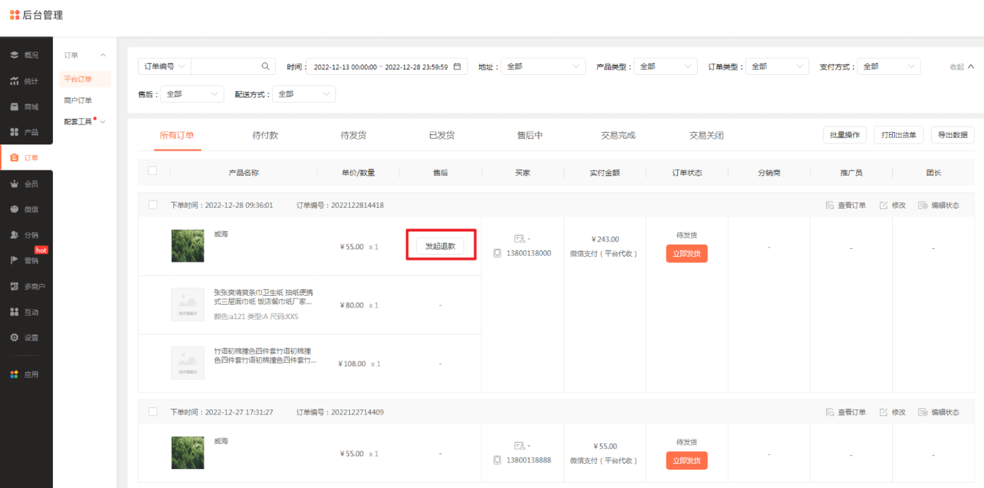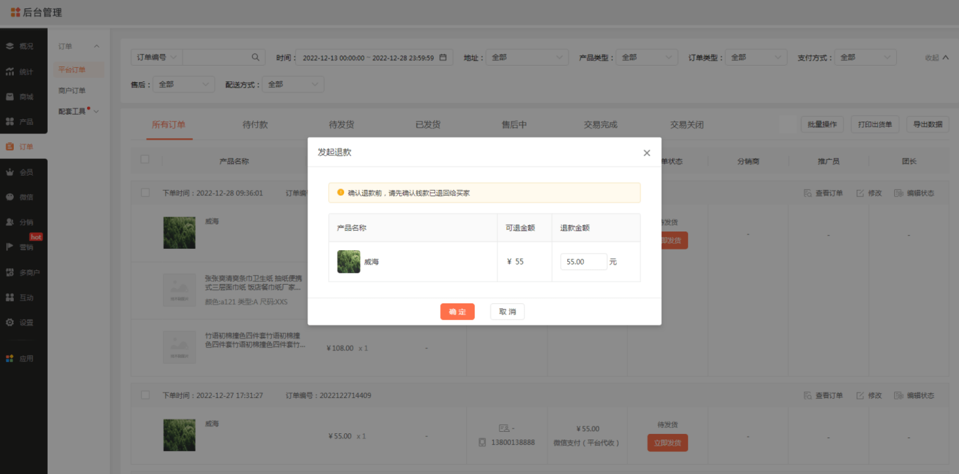 ▼ 功能说明 商家在【商城管理后台-会员-管理会员】中,可选择指定会员批量设为推广员。 商家在批量添加会员时,可在excel中填写推广员信息,导入成功后同步完成设置。 商家在【商城管理后台-推广员-推广员管理】中,可直接添加推广员。 二、会员卡支持推广员推广 ▼ 使用场景 商家可指定会员卡为推广产品。指定后,推广员推广会员卡可结算推广奖励,以吸引更多推广员进行推介,提升会员卡经营效果。 ▼ 功能说明 商家在【商城管理后台-推广员-推广产品】中,可直接指定会员卡为推广产品。 推广员在【推广中心-推广产品】中,可选择会员卡进行推广,买家完成购买后,即可结算推广奖励。 三、支持商家发起退款 ▼ 使用场景 商家可对指定订单的商品发起退款: ① 线上支付订单:商家发起退款后,微信支付/支付宝将按照退款规则,把钱款原路退回至买家支付的帐号上 ② 自定义支付订单:商家发起退款前,需确认钱款已线下退回给买家 ▼ 功能说明 商家在【商城管理后台-订单-管理订单】中,可对指定订单的商品发起退款。